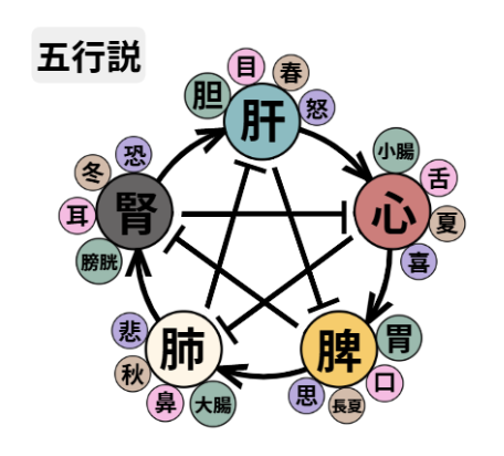 五行説とは、自然界や人体などあらゆるものを木・火・土・金・水の五つの要素に分類する中医学の理論の一つです。